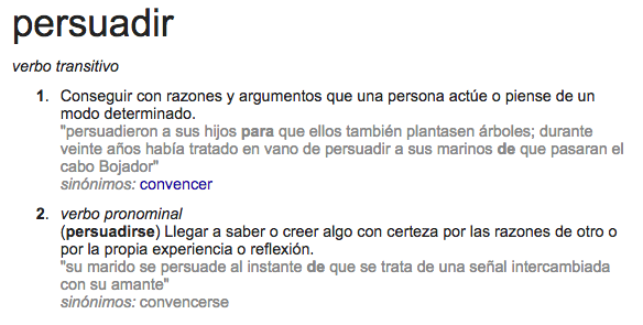 Persuadir es un sinónimo de convencer. Pero persuade mejor quien además de contar con la información intelectual que se requiere para convencer, además se ha tomado el tiempo de profundizar en su relación con otros, conociéndolos mejor y comprendiendo sus frustraciones y anhelos, para presentar sus argumentos de modo que sea casi el otro, el persuadido, quien se sienta convencido por sí mismo de lo que va a decidir.