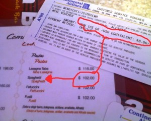 Menos del 2% de la cantidad que, por lo menos en mi caso, pagué por los boletos de vuelo redondo a esta ciudad Texana y que fue bonificado como compensación para que, durante la espera de más de 3 horas (adicionales a las 3 que ya habíamos esperado) pudiéramos comer algo en el restaurante de su elección, no de la nuestra, y en el que por cierto el alimento más barato costaba ciento dos pesos versus los 105 del valor del cupón.